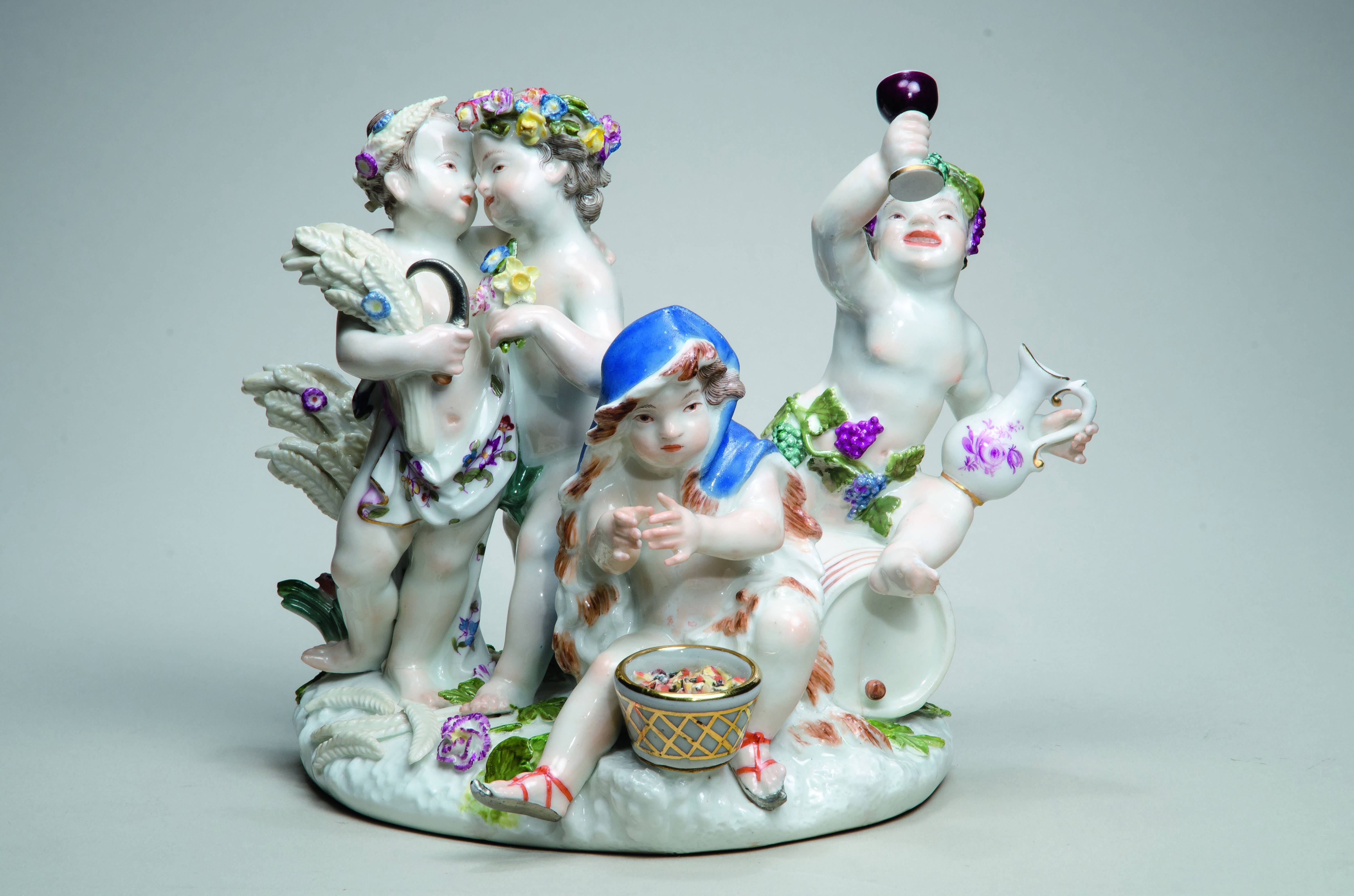 Johann Joachim Kändler (1706-1775) war einer der berühmtesten Porzellanmodelleure. Die von ihm geschaffenen Vier Jahreszeiten sind hier als kleine verspielte Kinder dargestellt. Im Vordergrund sitzt der Winter mit über den Kopf gezogenem Mäntelchen. Der links stehende Sommer mit Weizen und Sichel als Zeichen der Ernte liebkost mit der Personifikation des Frühlings, die einen Blumenkranz auf dem Kopf trägt und Blumen in der Hand hält. Rechts steht der Herbst mit dem jungen Wein in der Kanne und im Glaspokal in der erhobenen Rechten, bekränzt mit Weinblättern und –trauben.