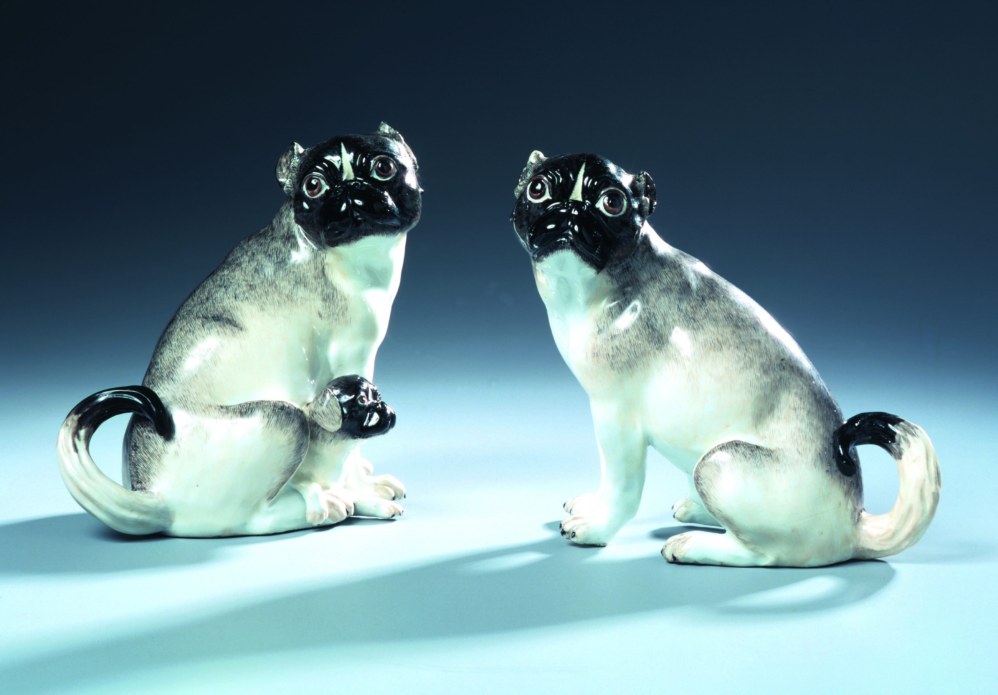 Johann Joachim Kändler (1706-1775) war einer der berühmtesten Porzellanmodelleure. Einen Namen machte er sich zunächst mit den sehr naturgetreuen Tierdarstellungen. Er schuf u.a. viele Werke für das „Porzellanschloss (Japanisches Palais) in Dresden, in dem August der Starke neben seiner aussergewöhnlichen Sammlung an chinesischem Porzellan auch viel Porzellan der noch jungen Meissener Porzellanmanufaktur ausstellen wollte, u.a. diese Möpse.