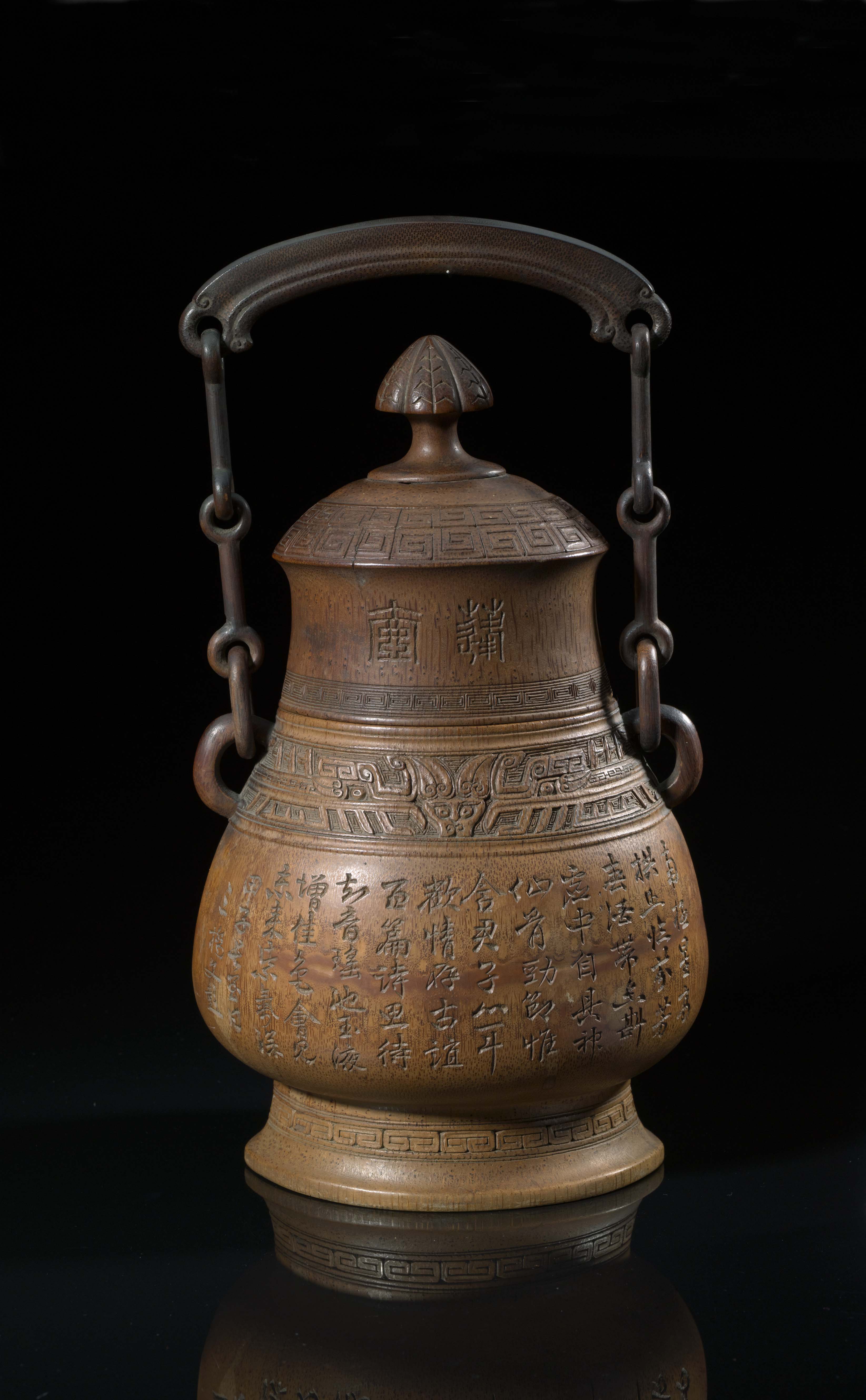 Qing-Dynastie (1644-1911), H: 27,5 cm; L: 14 cm, B: 11,1 cm (unten); L: 17 cm, B: 14,4 cm (Bauch), Shanghai, Shanghai Museum, Inv.-Nr. 24297 Dieses aus einem unterirdischen Bambushalm geschnitzte Werk ist die Nachbildung eines You, einer Art antikem bronzenen Weingefäss. Der äussere Ring des Deckels ist mit einem recht-eckigen Spiralmuster verziert, während schnurförmige Muster und Monstermaskendesigns die Mitte des Gefässes do minieren. Der untere Teil des Gefässes ist mit einem Wolken- und Donnermuster verziert. Ein Kettenhenkel ist mit zwei Ringen verbunden, die durch die Monstermaske getrennt sind. Auf einer Seite gibt es flache geschnitzte Inschriften: penghu (ein Paradiesberg über dem Meer) und ein Wen Peng (1498-1573) zuge-schriebenes Gedicht darunter.
