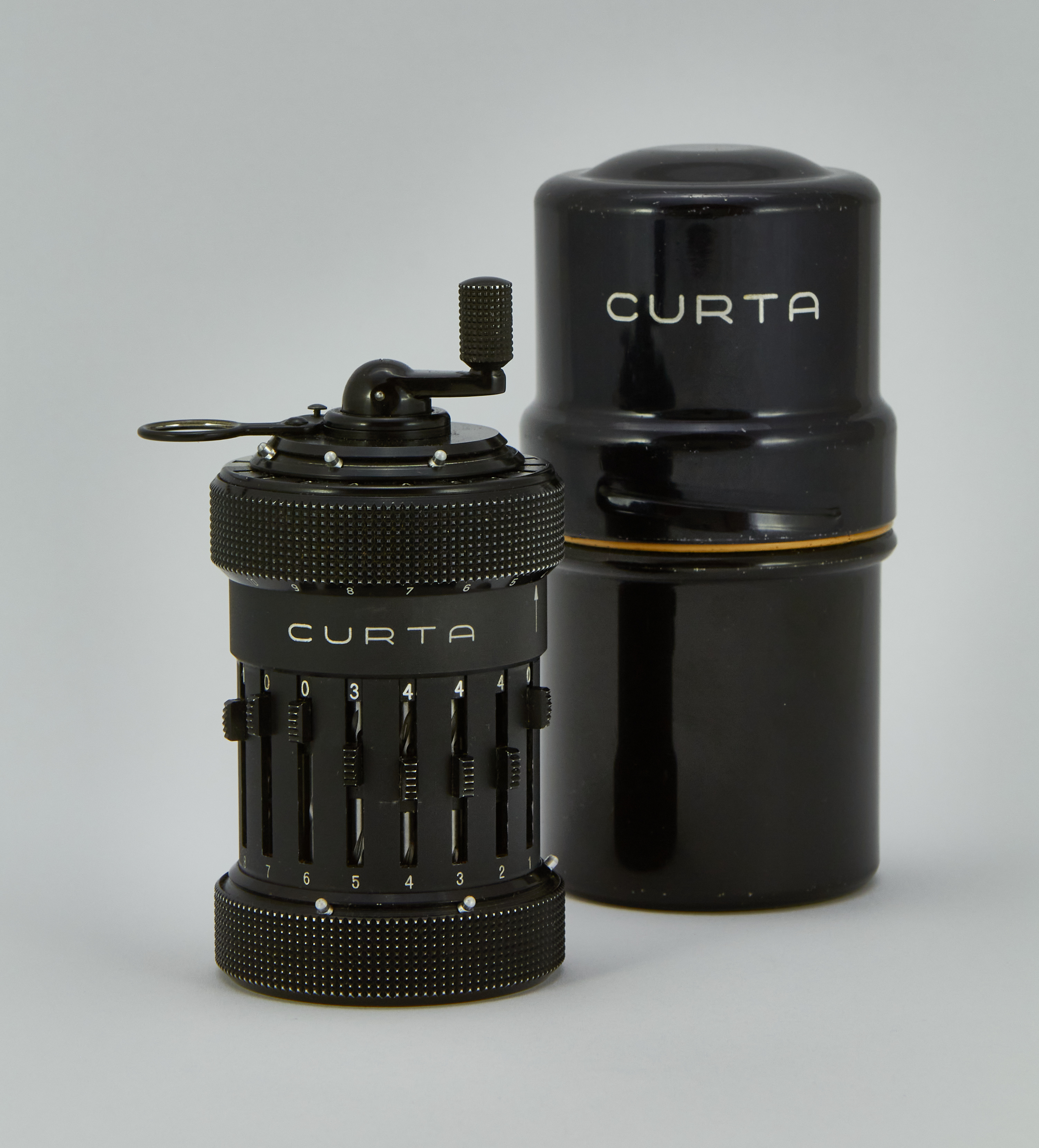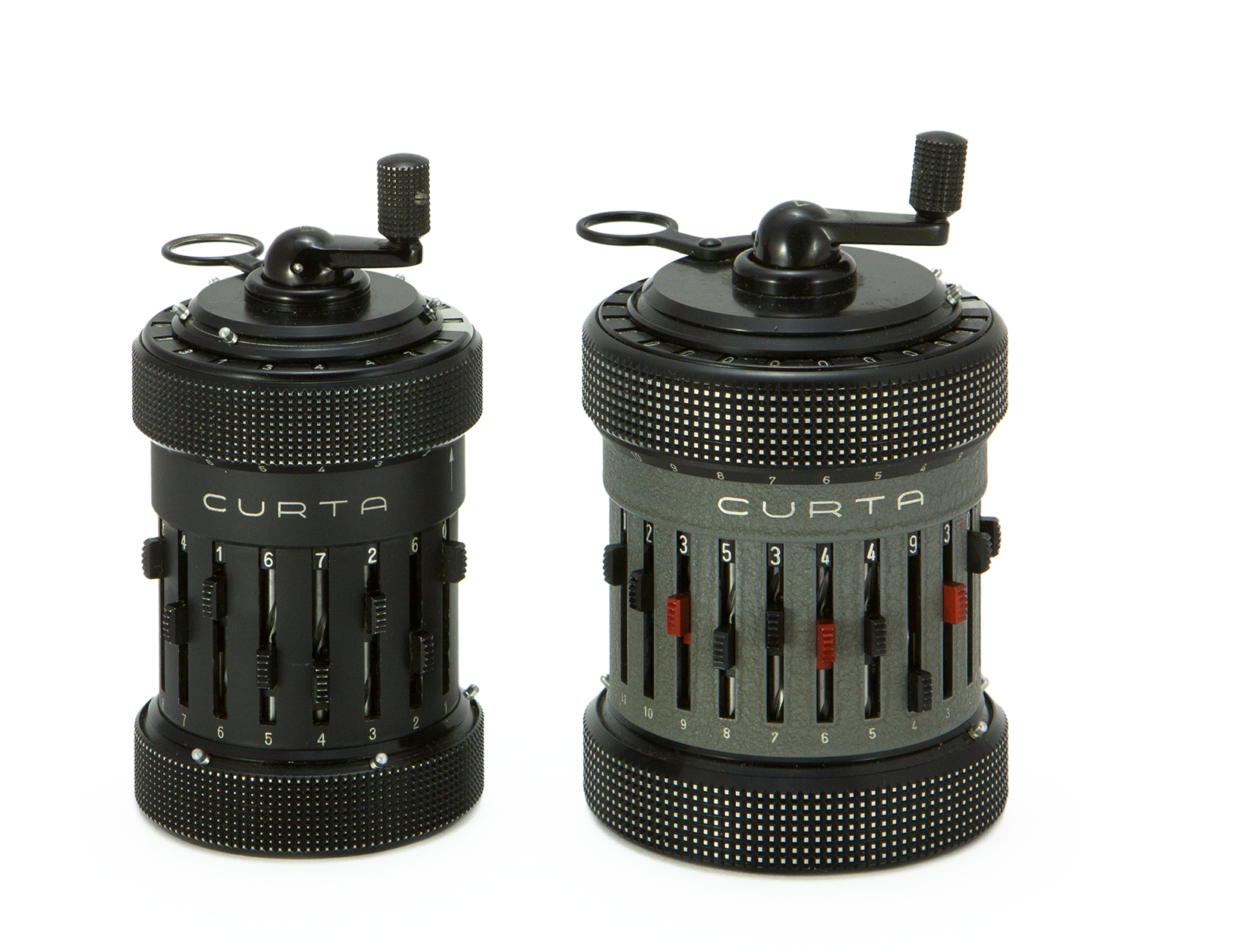 Quelle: Hansjörg Nipp Es wurden zwei verschiedenen Grössen der Rechenmaschinen gebaut. Die Curta I (links) hat 8 Eingabestellen und kann Resultate bis 11 Stellen anzeigen. Die Curta II (rechts) hat 11 Eingabestellen und kann Resultate bis 15 Stellen anzeigen. Sie hat also einen grösseren Rechenbereich. Die Maschinen unterschieden sich auch in der Grösse: Curta I: Durchmesser 53 mm, Höhe 85 mm Curta II: Durchmesser 65 mm, Höhe 90 mm