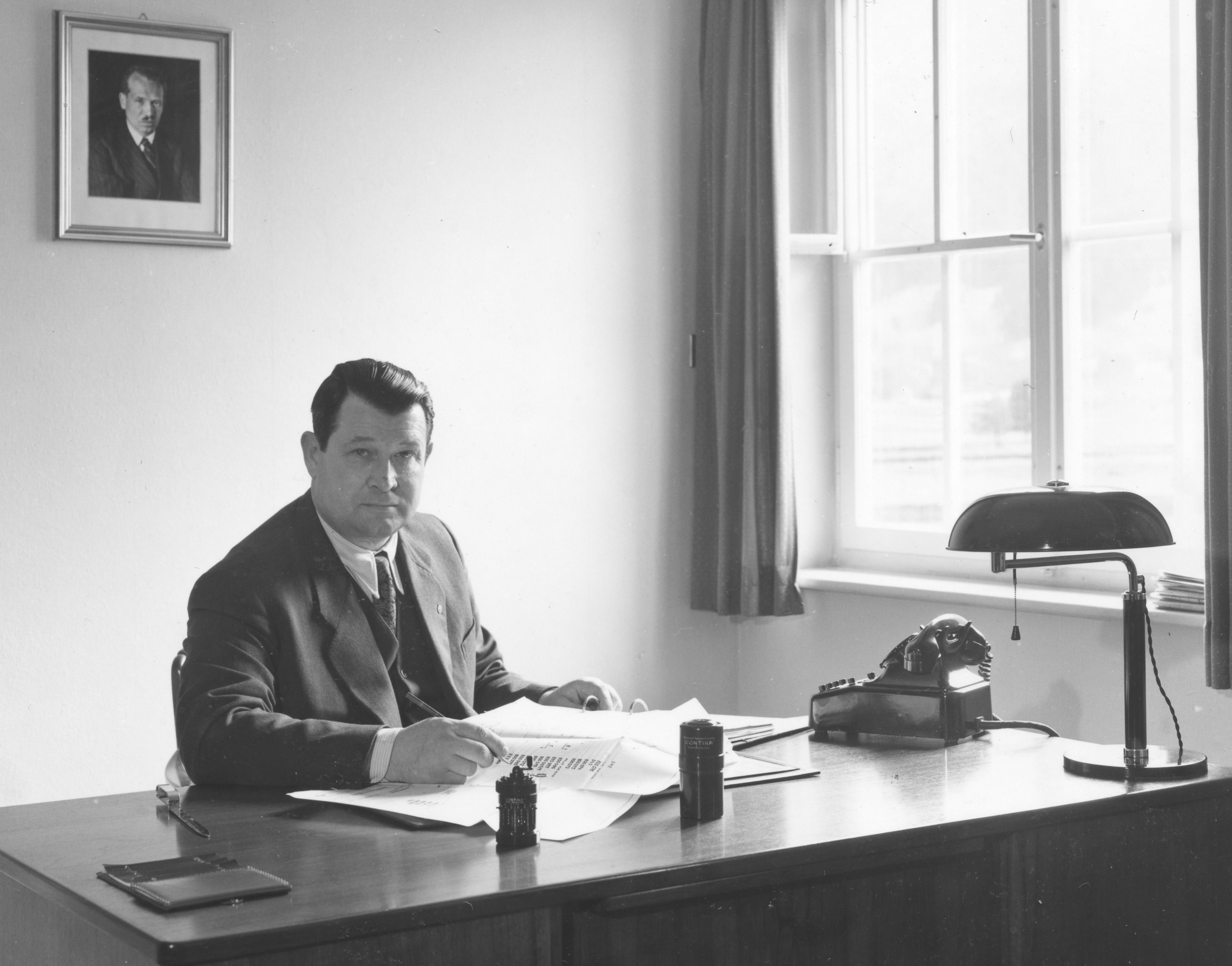 Direktor Curt Herzstark in seinem Büro (um 1948) in der Contina AG. Herzstark brachte seine Erfindung ein und baute die Firma auf.