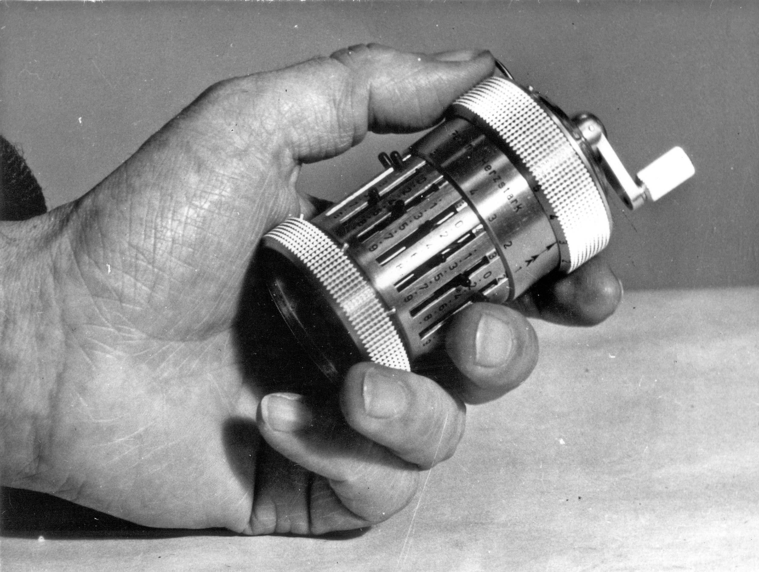 Nach seiner Haft im Konzentrationslager liess Curt Herzstark Prototypen seiner Rechenmaschinen, die er dort konstruiert hatte, bauen. Das Bild zeigt einen solchen Prototypen in der Hand des Erfinders. Herzstark führte ihn 1946 Fürst Franz Josef II auf Schloss Vaduz vor.