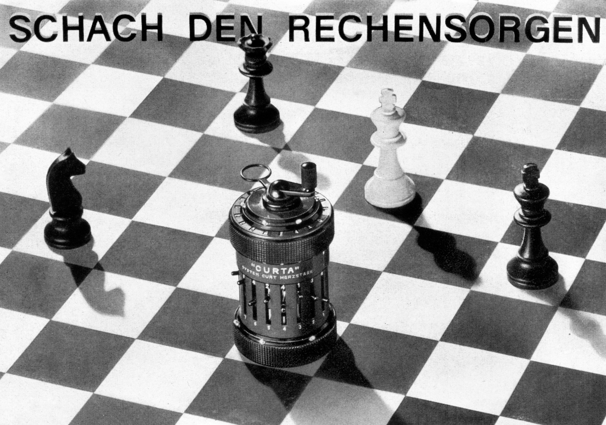 Der Werbeprospekt (um 1949/50) will sagen, dass es nun eine kleine Rechenmaschine (Taschenrechner) gibt. Die Grösse ersieht man aus dem Vergleich mit den Schachfiguren.