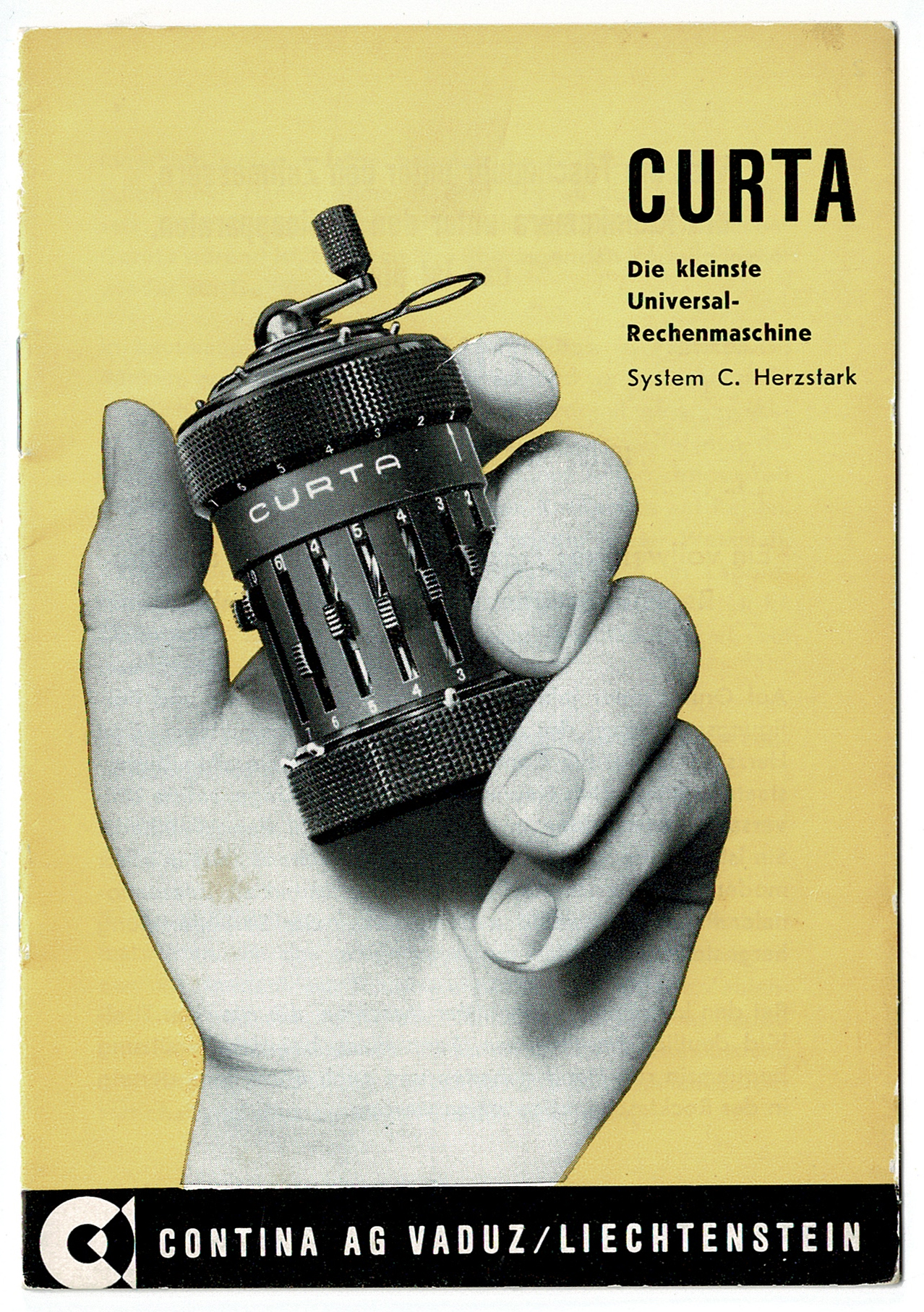 Zitat erste Seite innen: Was die Taschenuhr unter den Zeitmessern, die Kleinkamera unter den Photoapparaten, das ist die CURTA unter den Rechenmaschinen: Ein vollwertiges Präzisionsinstrument für alle Rechnungsarten, überall mitnehmbar.
