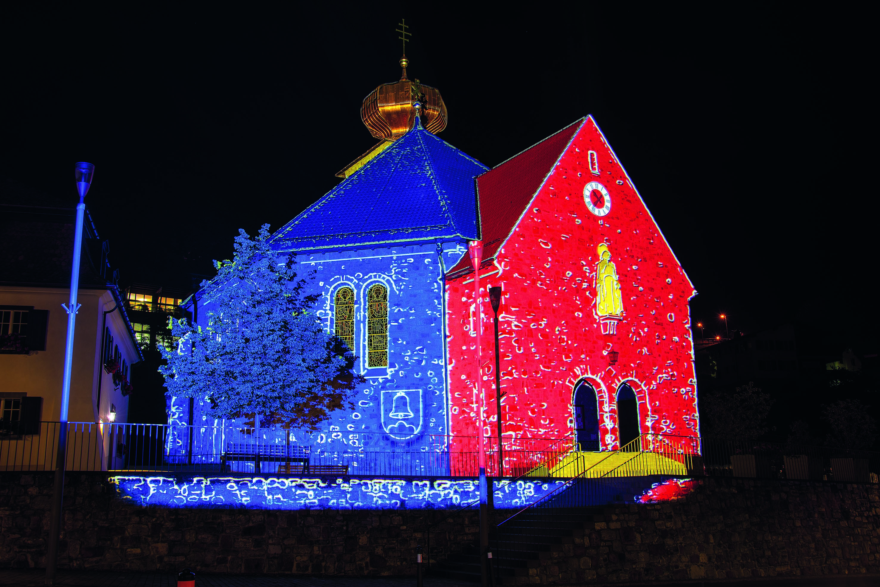 2021 feierte das Fürstentum Liechtenstein, bedingt durch die Corona-Pandemie, seinen Staatsfeiertag in allen 11 Gemeinden unter dem Motto: 11 Gemeinden 1 Land. Am Abend des 15. Augusts gab es das Schloss Vaduz und zehn ausgesuchte Gebäude in den Gemeinden Liechtensteins auf neue Weise zu entdecken und die beeindruckende Lichtkunst mit kreativen Illuminationen in Blau-Rot-Gold und dem jeweiligen Gemeindewappen zu sehen. Durch Lichtfarben wurden die Bauwerke von der Umgebung abgehoben und Details, die im Alltag oft unbemerkt bleiben, akzentuiert. Menschen trafen sich und genossen die stimmungsvolle Atmosphäre und die facettenreichen Lichtkulissen. Silvia Abderhalden und Albert Mennel haben diese «Architektur für eine Nacht» mit Langzeitbelichtung an ausgesuchten Positionen fotografisch festgehalten und es entstanden kunstvolle «Licht»-Bilder.